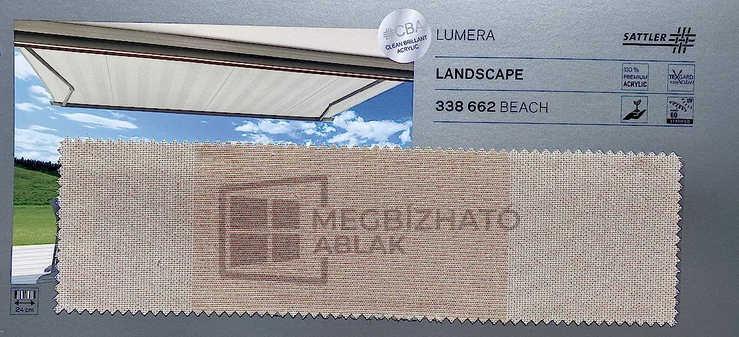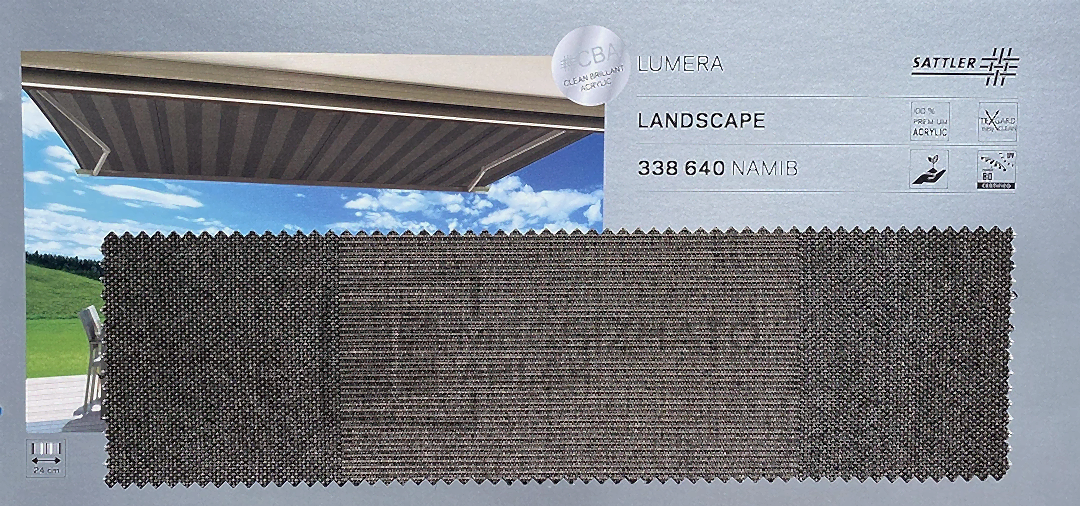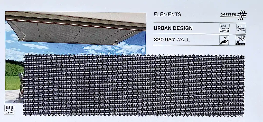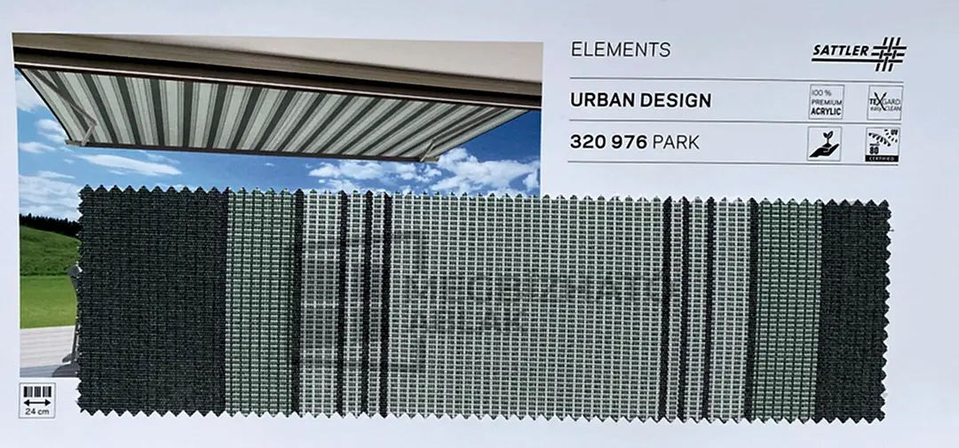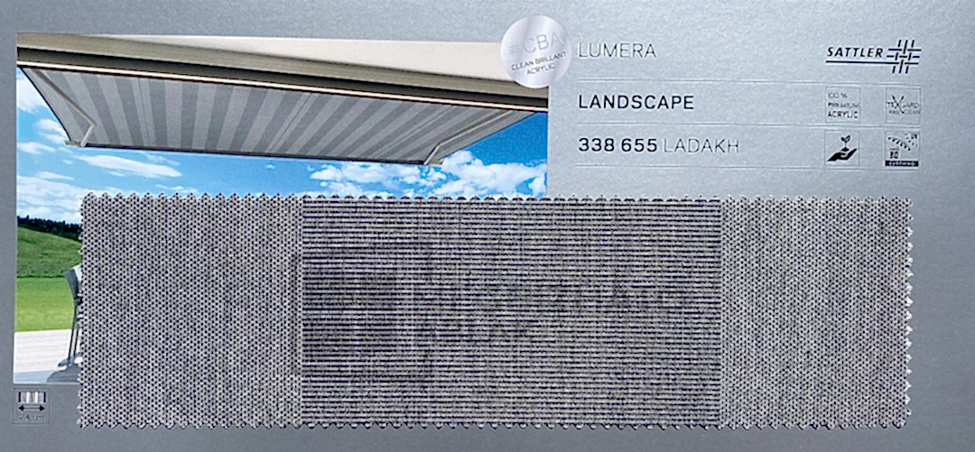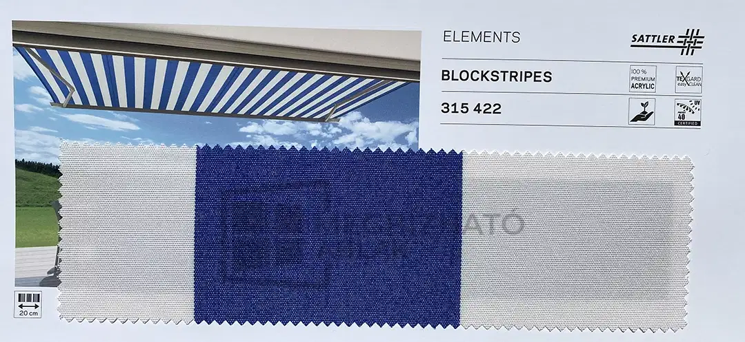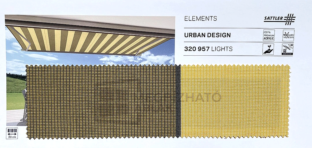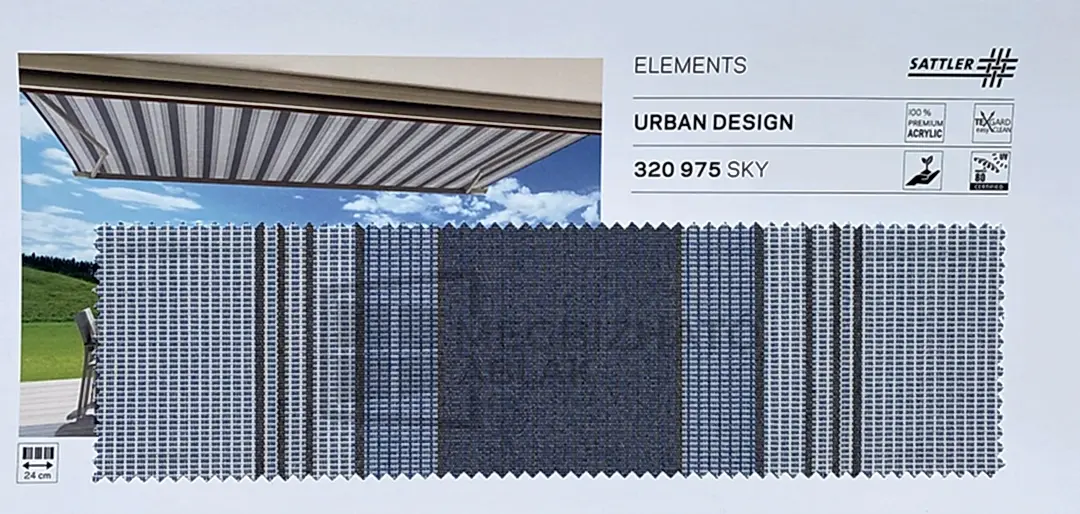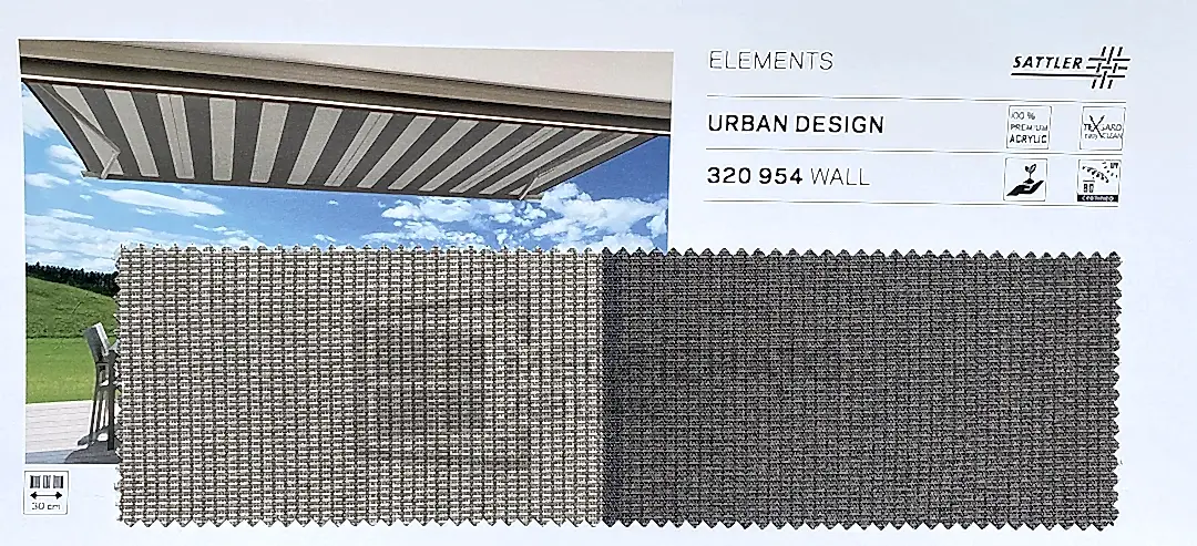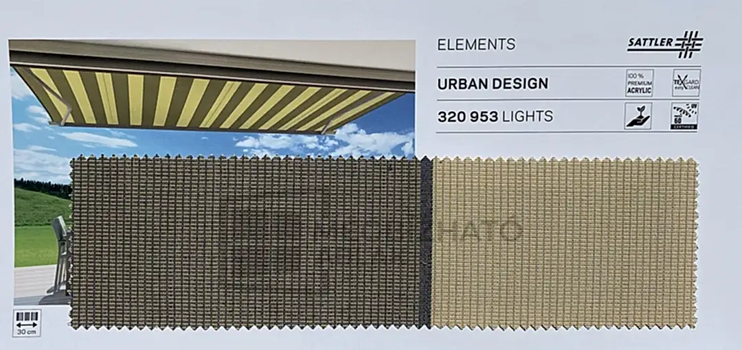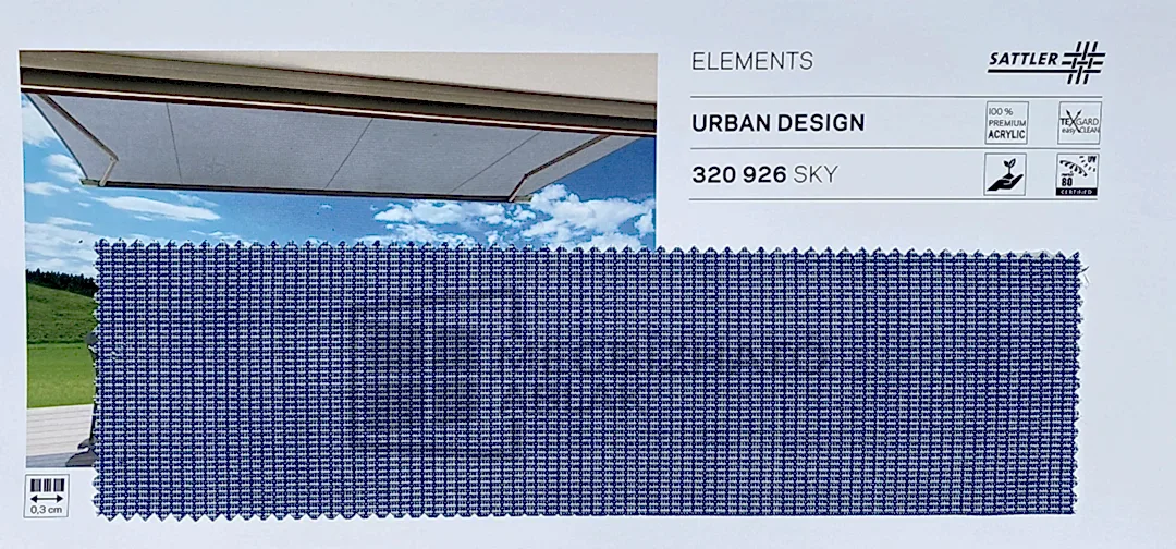 A napellenző ponyvája a Sattler textíliákból készül, amelyek nem csak víz- és szennytaszító tulajdonságokkal bírnak, hanem ellenállnak a penészedésnek és az algásodásnak is; így az időjárás viszontagságai ellenére hosszú távon megőrzik szépségüket és funkcionalitásukat.