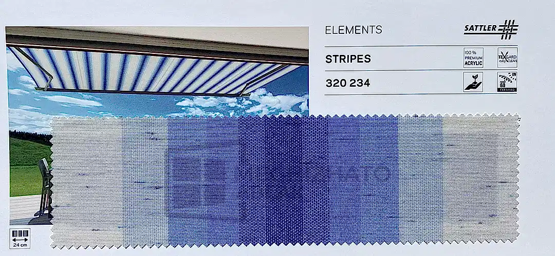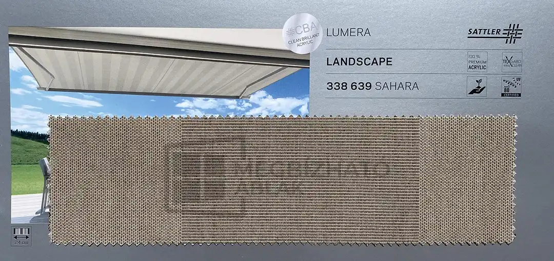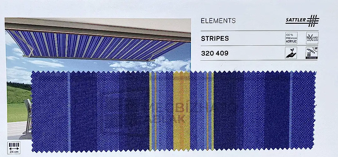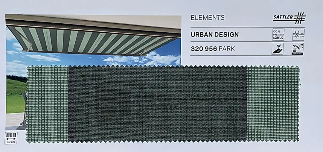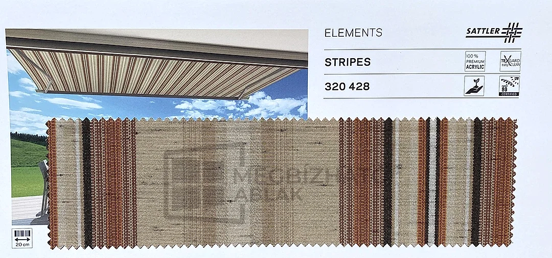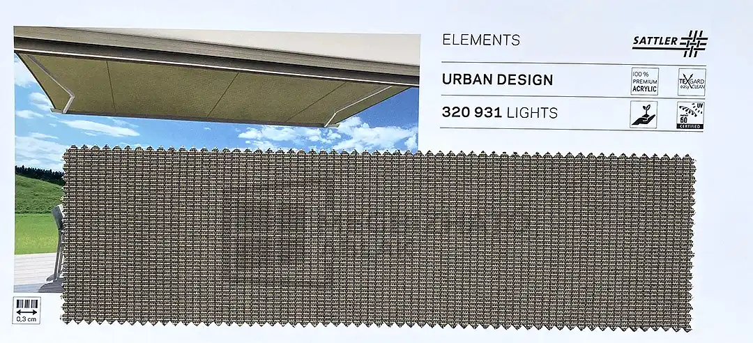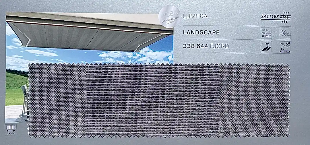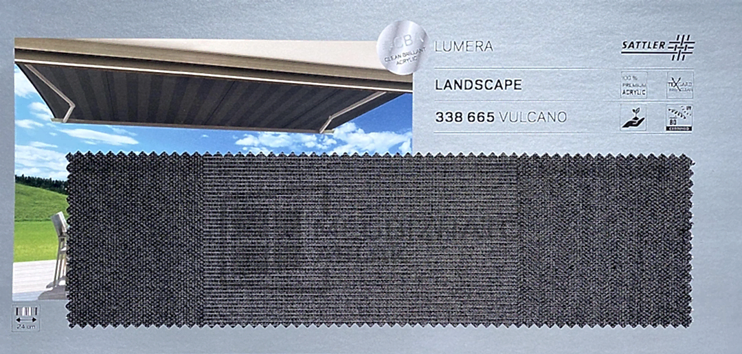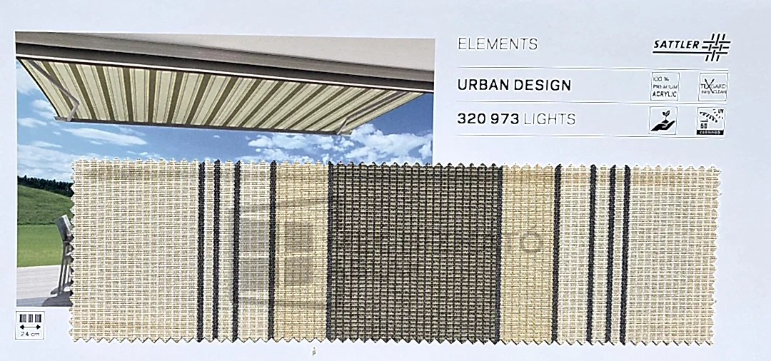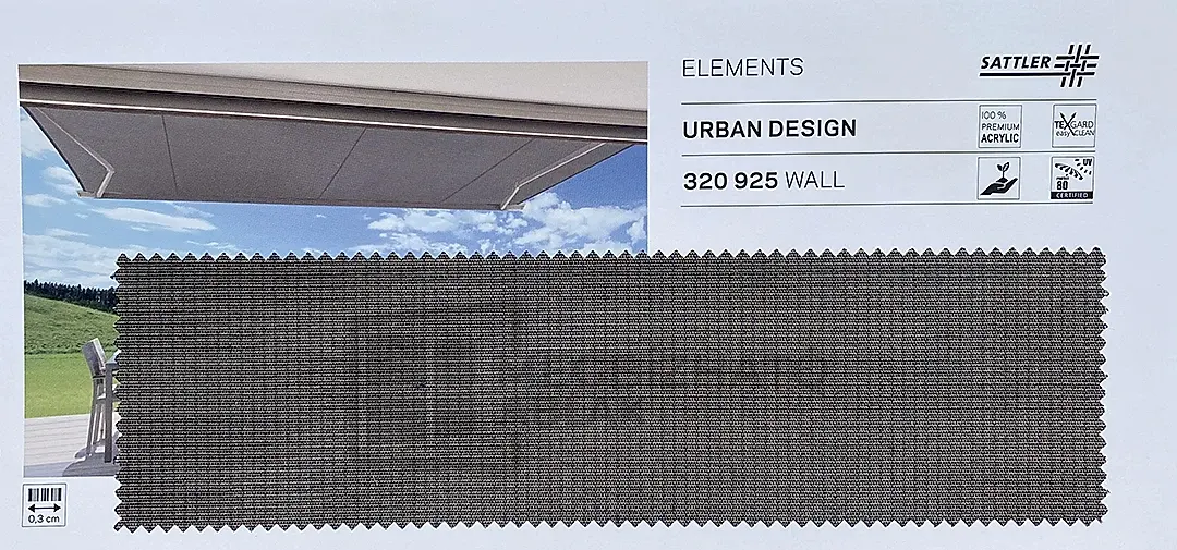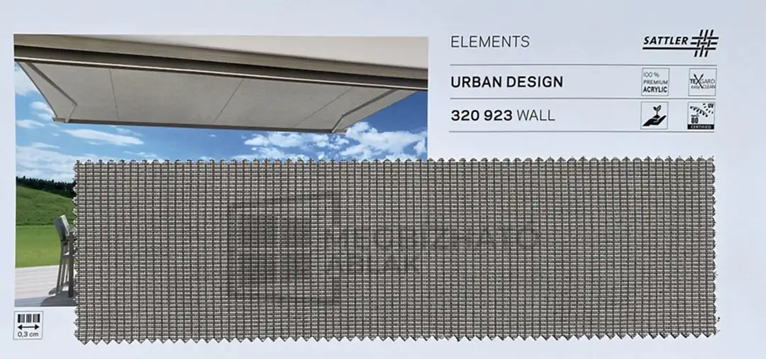 A napellenző ponyvája a Sattler textíliákból készül, amelyek nem csak víz- és szennytaszító tulajdonságokkal bírnak, hanem ellenállnak a penészedésnek és az algásodásnak is; így az időjárás viszontagságai ellenére hosszú távon megőrzik szépségüket és funkcionalitásukat.