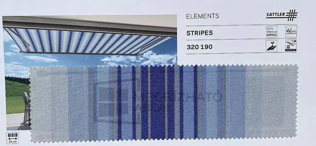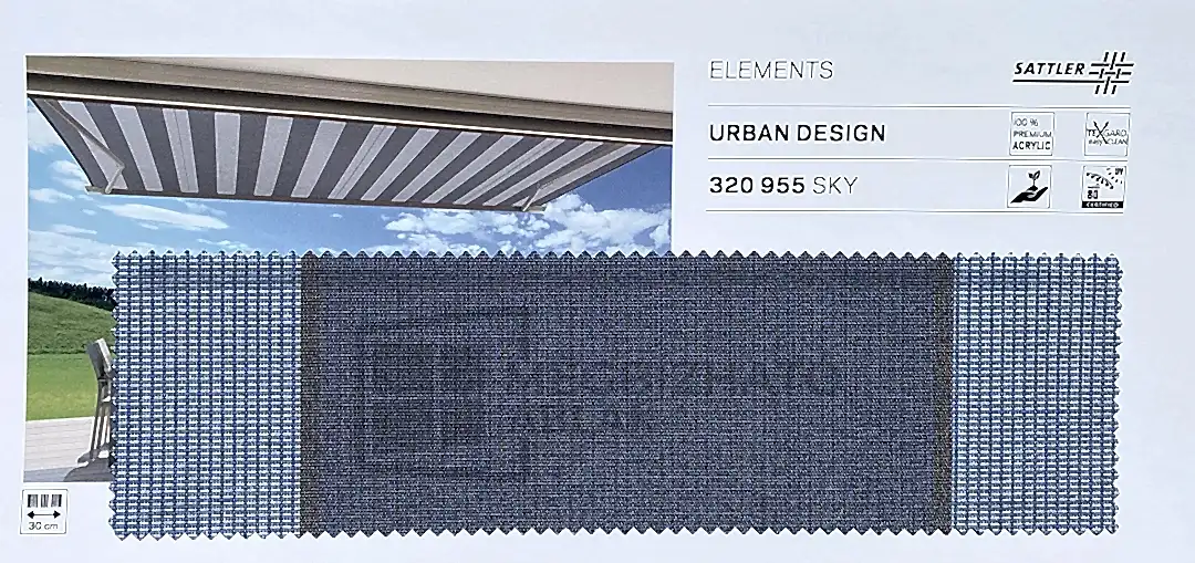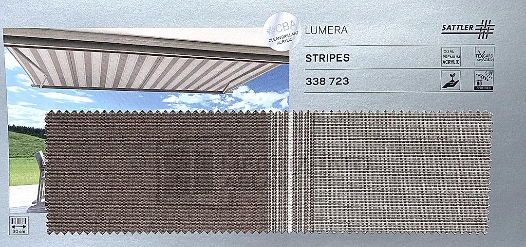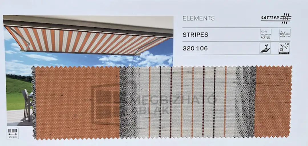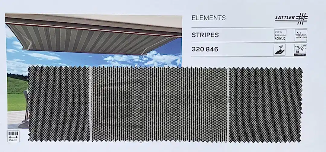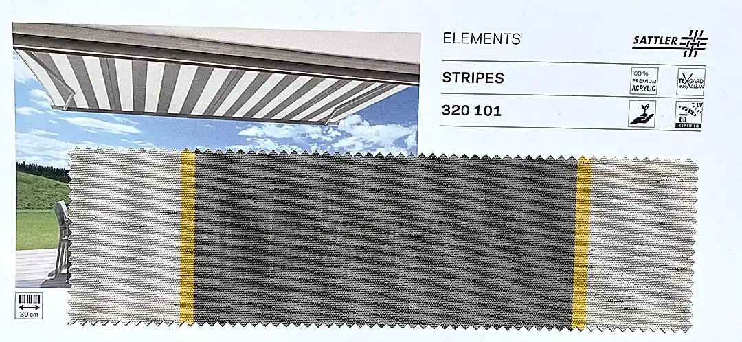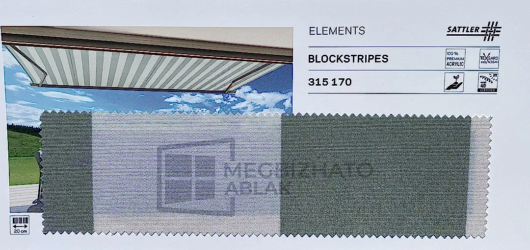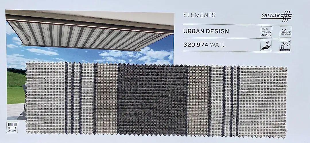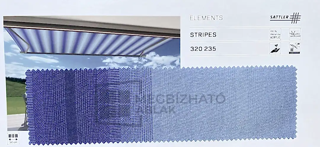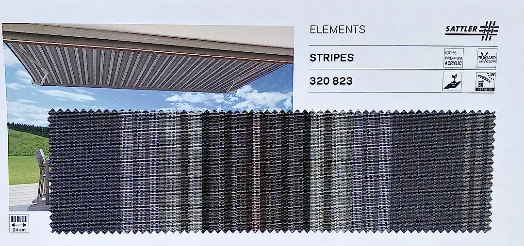A napellenző ponyvája a Sattler textíliákból készül, amelyek nem csak víz- és szennytaszító tulajdonságokkal bírnak, hanem ellenállnak a penészedésnek és az algásodásnak is; így az időjárás viszontagságai ellenére hosszú távon megőrzik szépségüket és funkcionalitásukat.