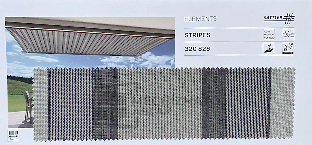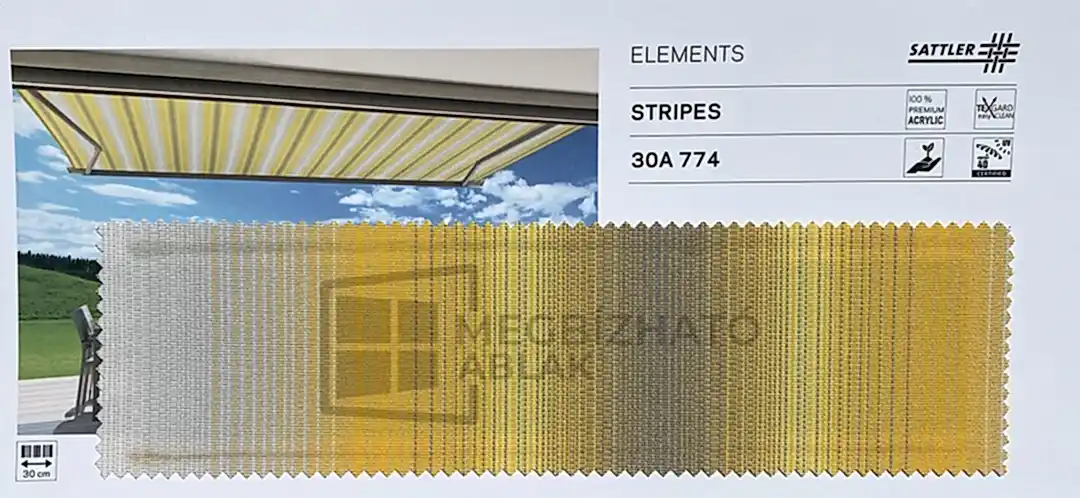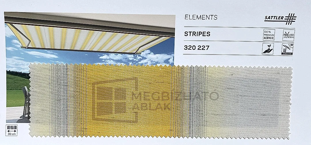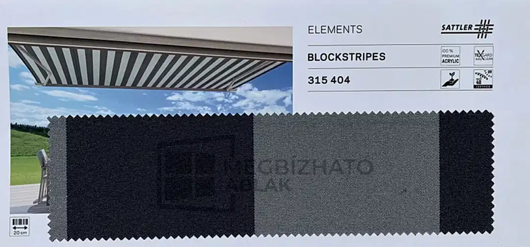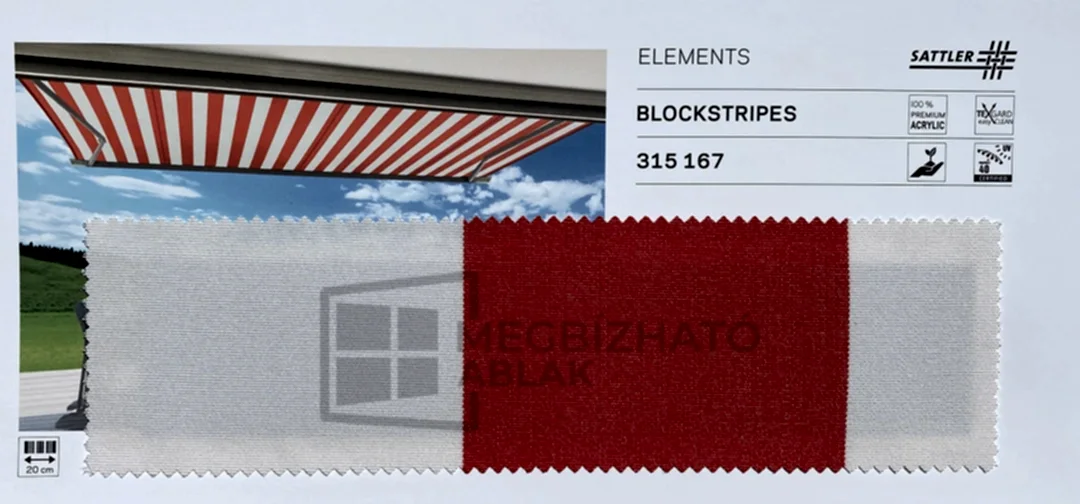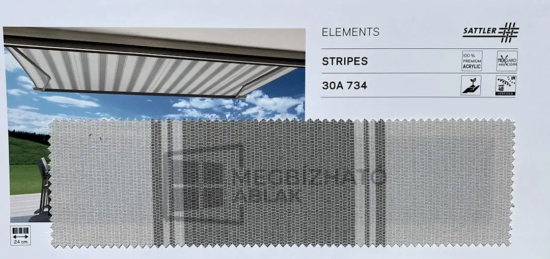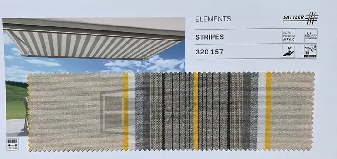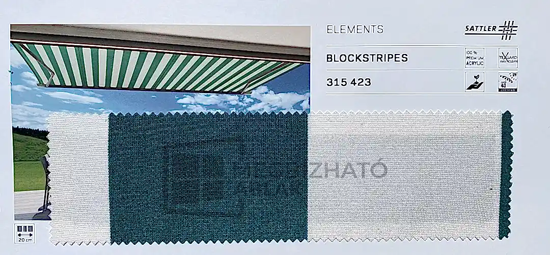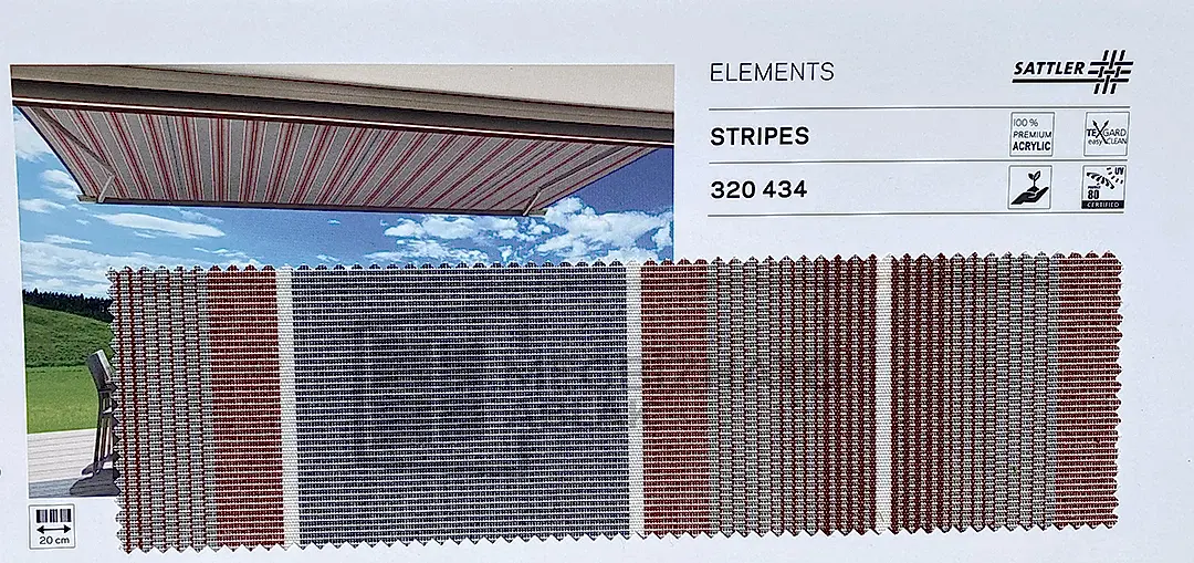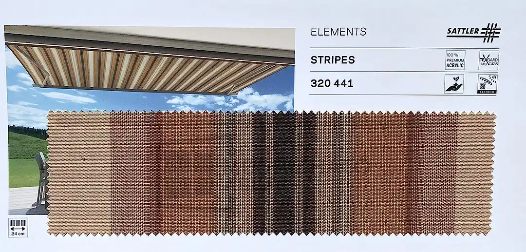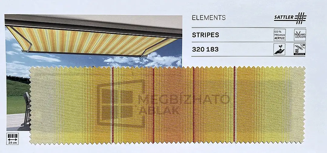 A napellenző ponyvája a Sattler textíliákból készül, amelyek nem csak víz- és szennytaszító tulajdonságokkal bírnak, hanem ellenállnak a penészedésnek és az algásodásnak is; így az időjárás viszontagságai ellenére hosszú távon megőrzik szépségüket és funkcionalitásukat.