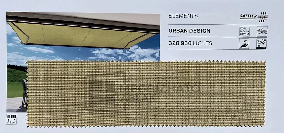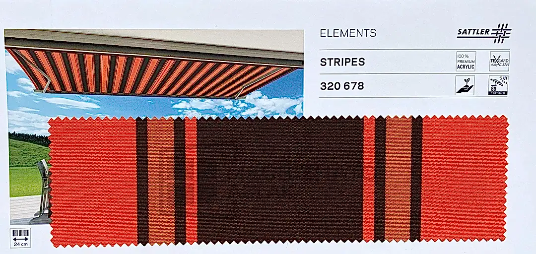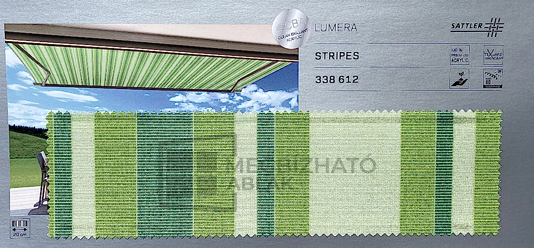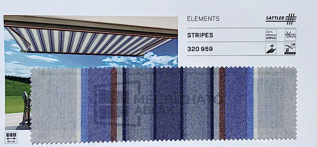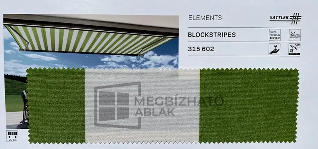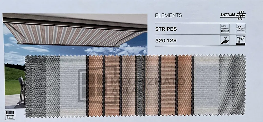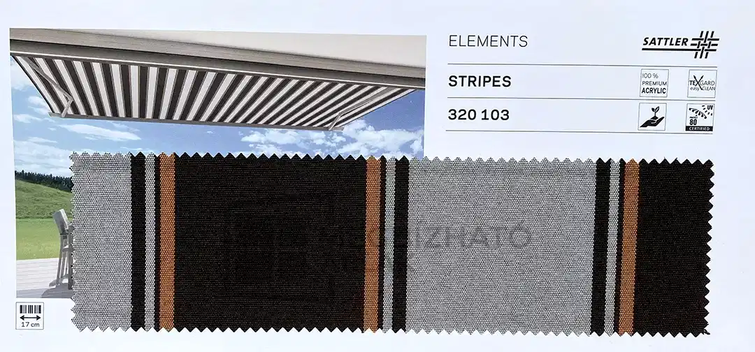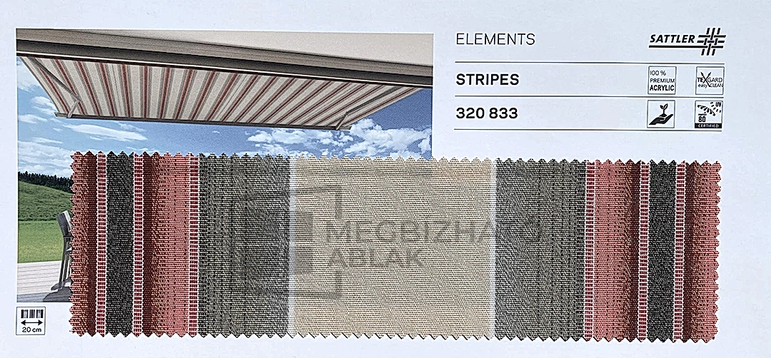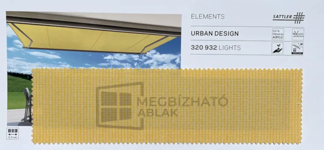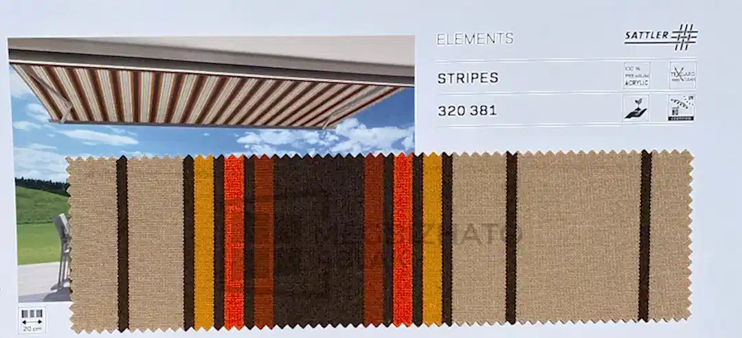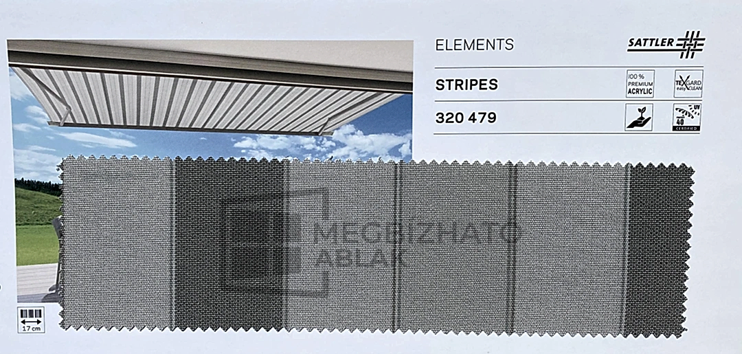 A napellenző ponyvája a Sattler textíliákból készül, amelyek nem csak víz- és szennytaszító tulajdonságokkal bírnak, hanem ellenállnak a penészedésnek és az algásodásnak is; így az időjárás viszontagságai ellenére hosszú távon megőrzik szépségüket és funkcionalitásukat.