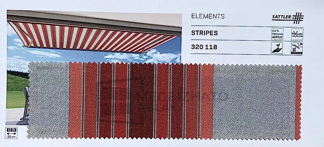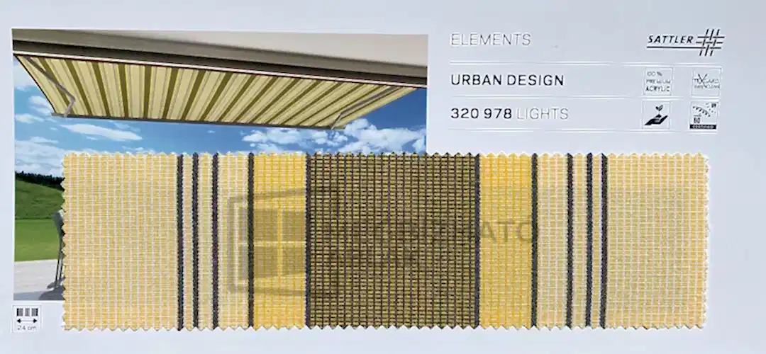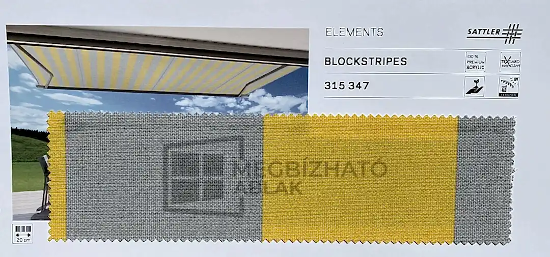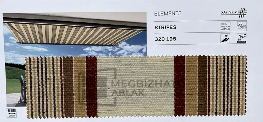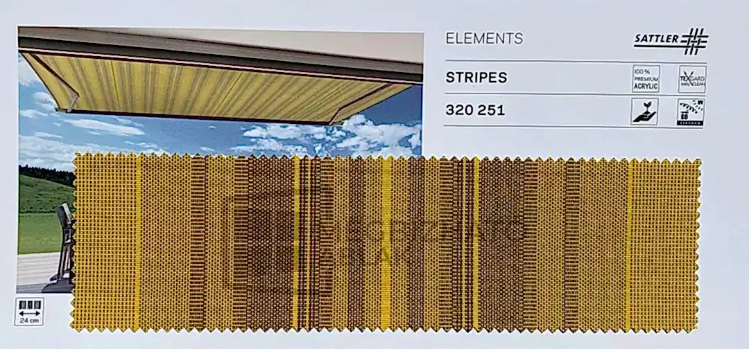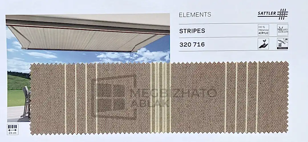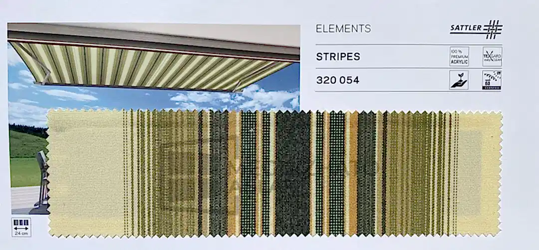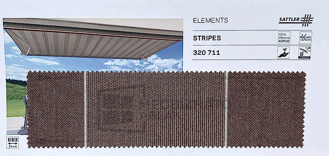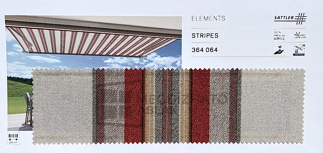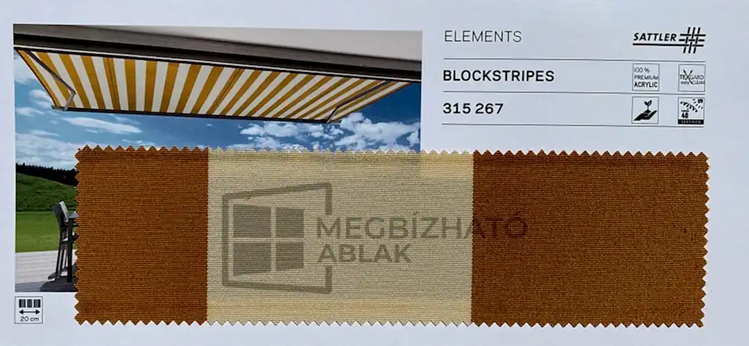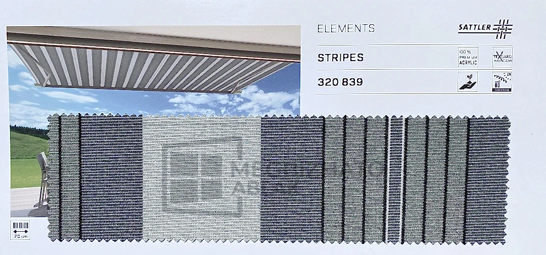 A napellenző ponyvája a Sattler textíliákból készül, amelyek nem csak víz- és szennytaszító tulajdonságokkal bírnak, hanem ellenállnak a penészedésnek és az algásodásnak is; így az időjárás viszontagságai ellenére hosszú távon megőrzik szépségüket és funkcionalitásukat.