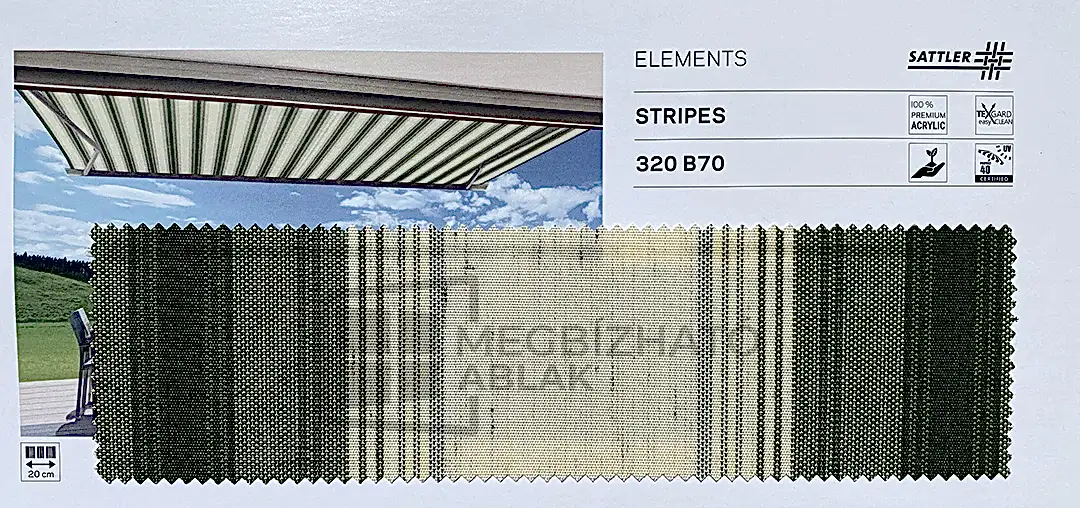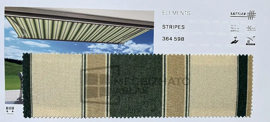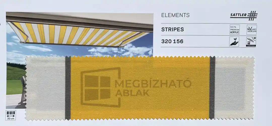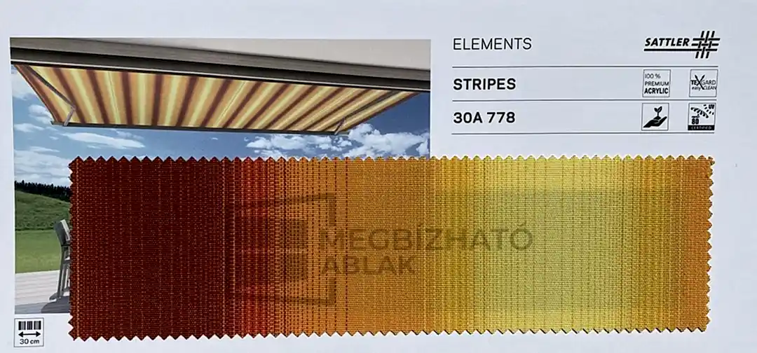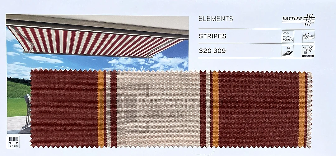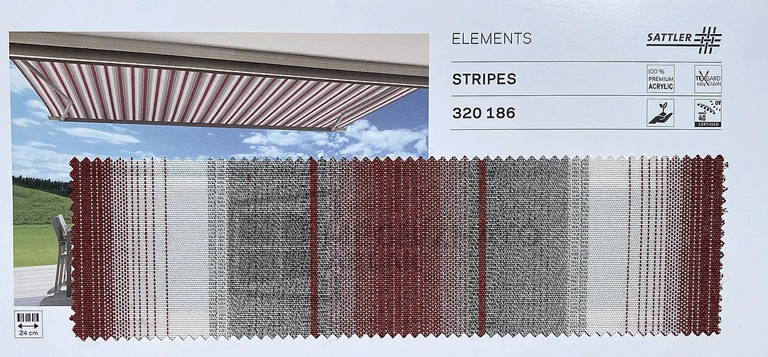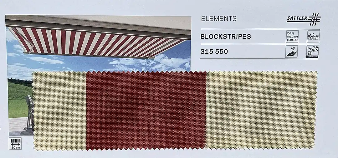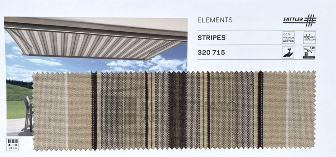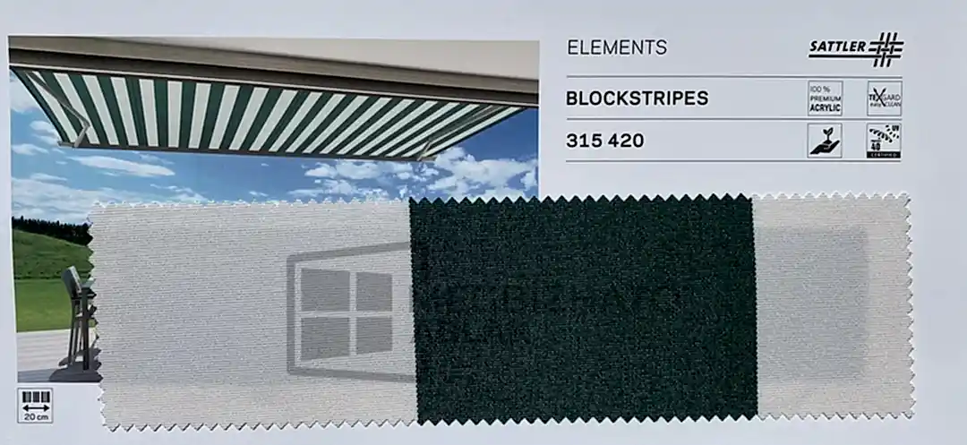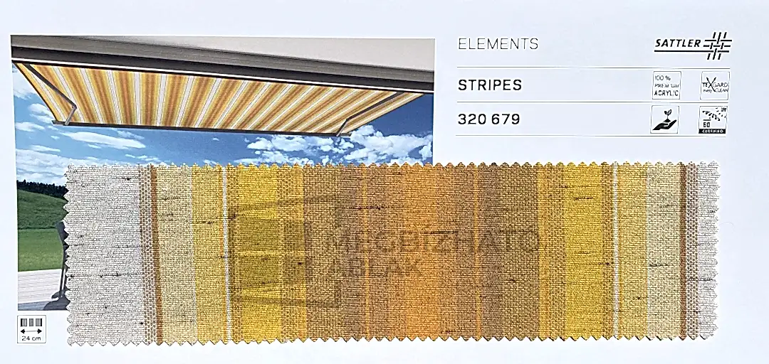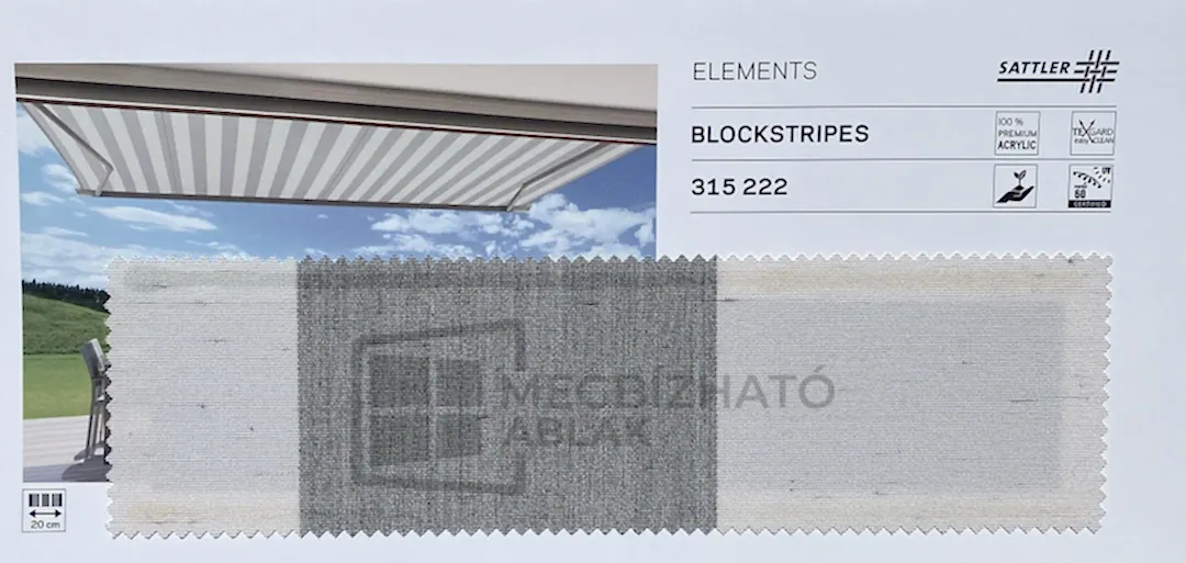 A napellenző ponyvája a Sattler textíliákból készül, amelyek nem csak víz- és szennytaszító tulajdonságokkal bírnak, hanem ellenállnak a penészedésnek és az algásodásnak is; így az időjárás viszontagságai ellenére hosszú távon megőrzik szépségüket és funkcionalitásukat.