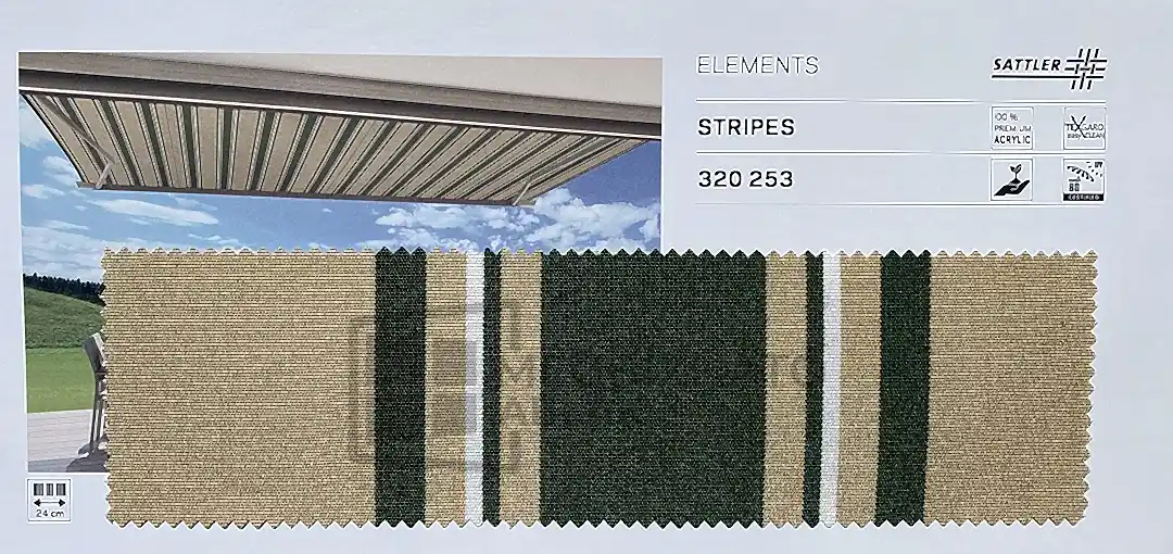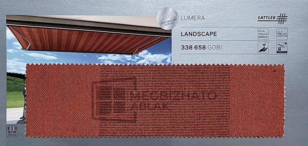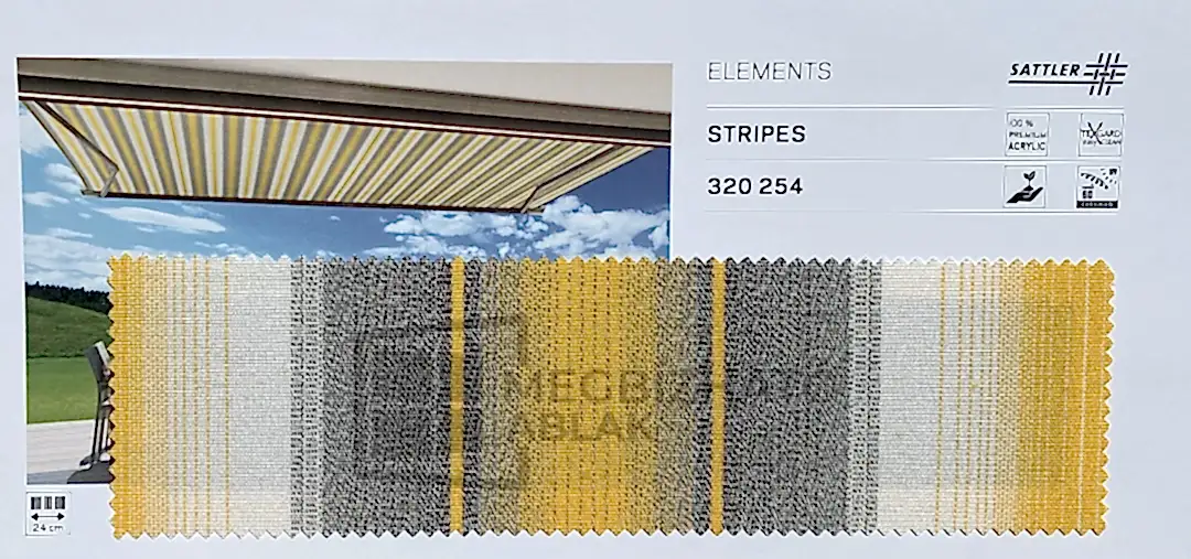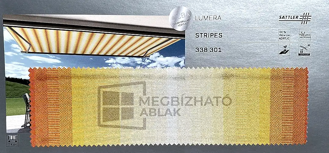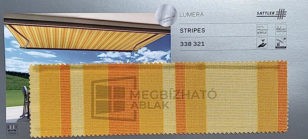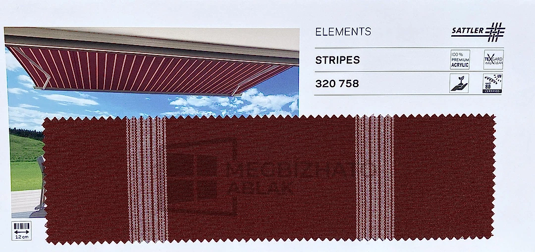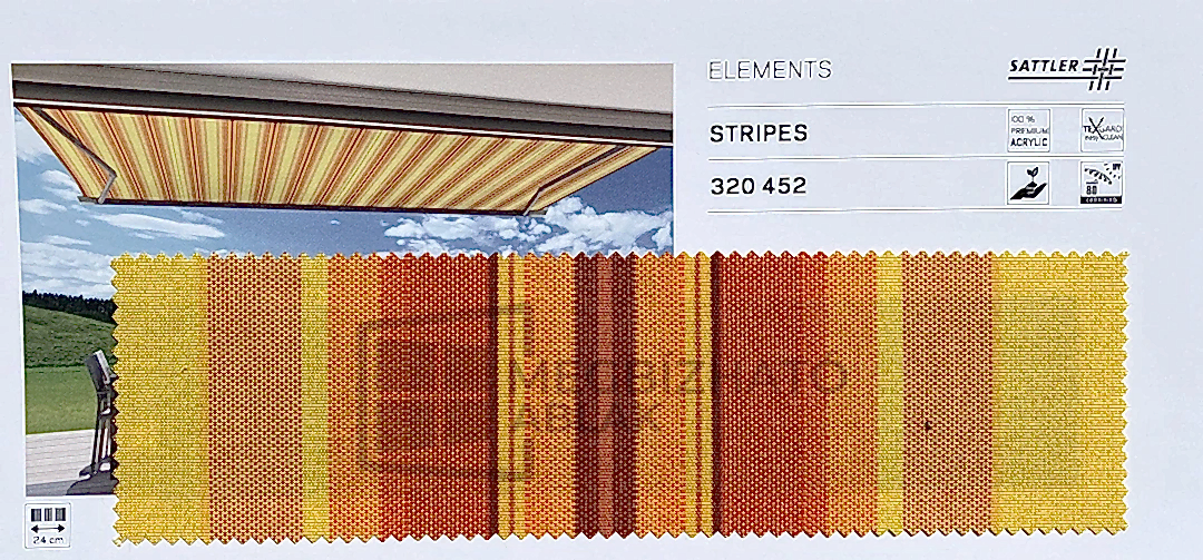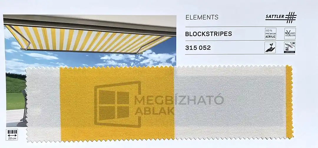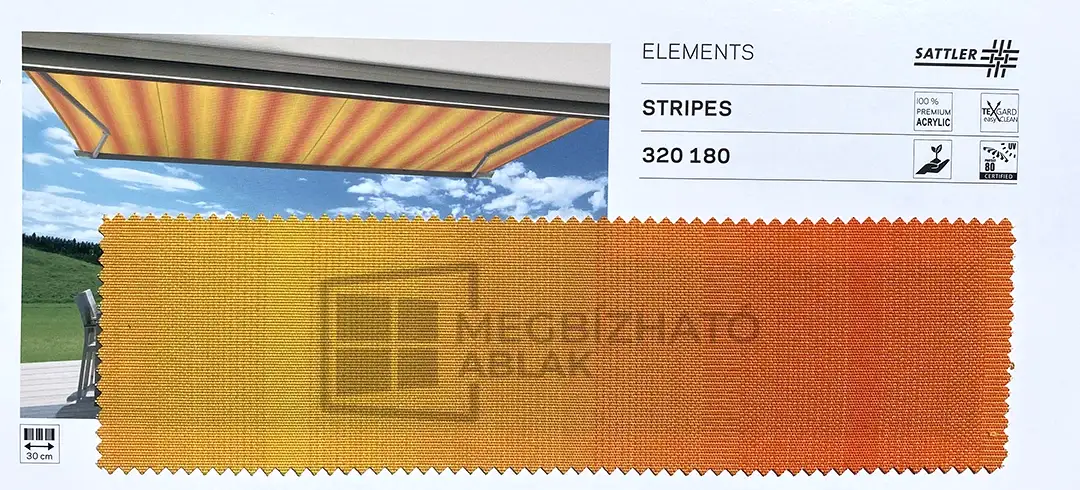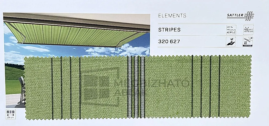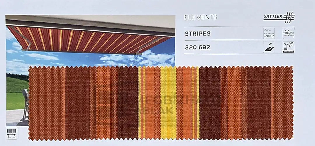 A napellenző ponyvája a Sattler textíliákból készül, amelyek nem csak víz- és szennytaszító tulajdonságokkal bírnak, hanem ellenállnak a penészedésnek és az algásodásnak is; így az időjárás viszontagságai ellenére hosszú távon megőrzik szépségüket és funkcionalitásukat.